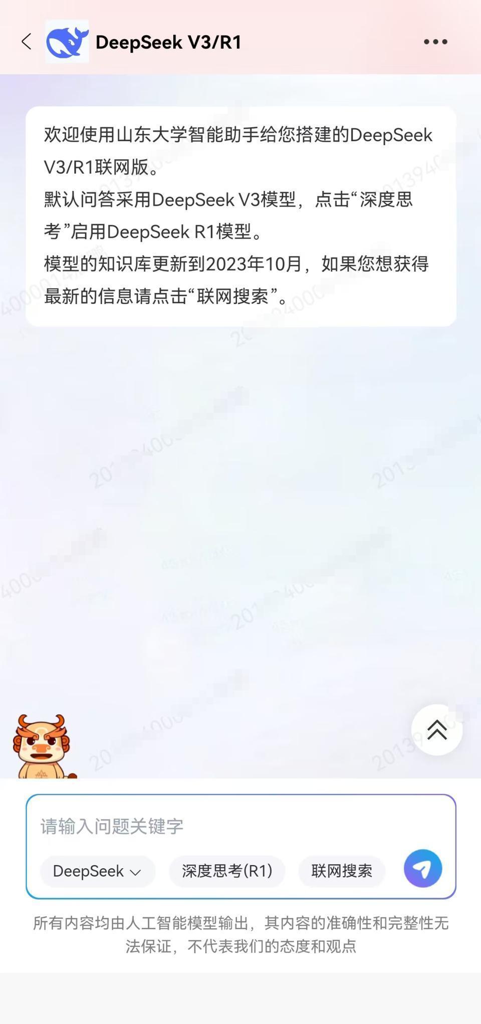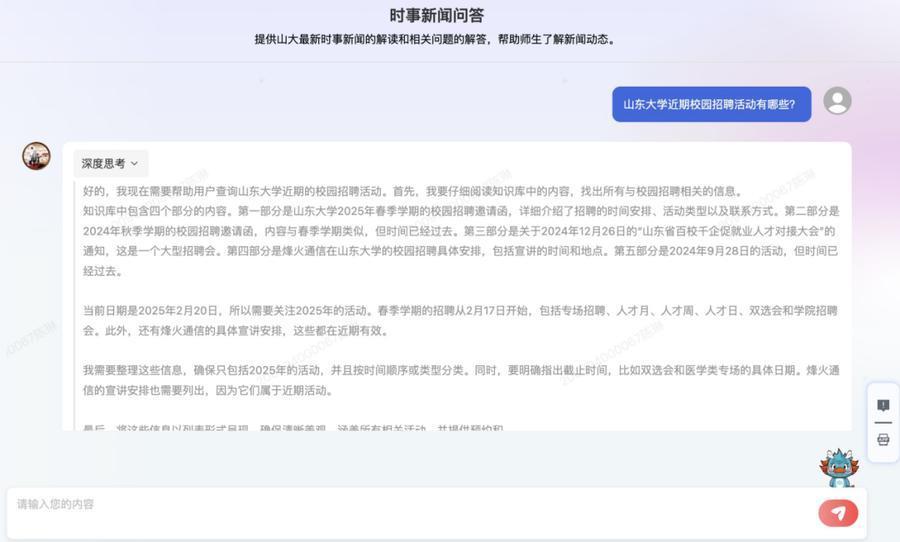 记者了解到,山大智能助手Web和App中的AI助手、服务咨询、学习生活、管理办公等板块中的智能应用均已升级接入DeepSeek-V3/R1大模型,在意图解析、知识筛选、回答精准度等方面均得到提升,快来体验吧。