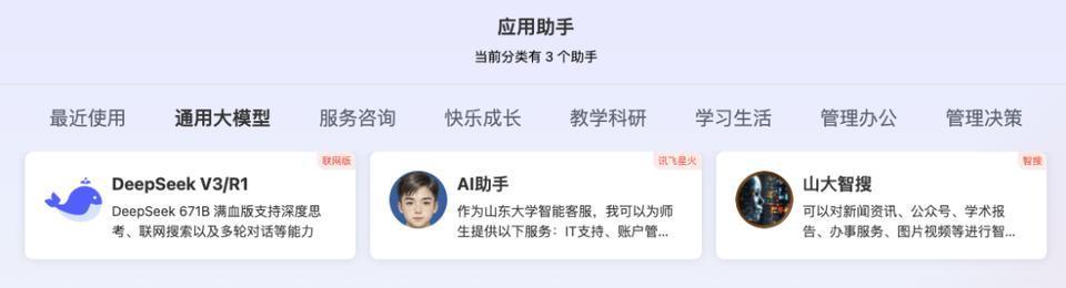 或者登录信息化公共服务平台点击“山大AI助手”图标进入在“应用助手-通用大模型”板块中点击【DeepSeek-V3/R1】开启您的DeepSeek之旅!